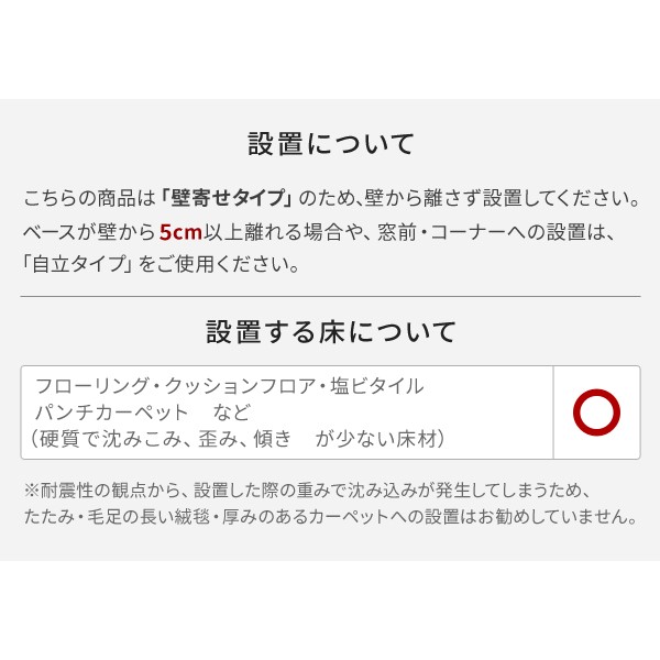 ■ EQUALS(イコールズ) ■WALL INTERIOR TV STAND V4 FLOOR TYPE(WALLインテリアテレビスタンドV4 フロアタイプ )サテンホワイト ◆ 主な特長 ◆大型50インチ〜90インチ(80kgまで)への対応を実現したフロアタイプ。大型テレビを取り付けた際のバランスを計算してデザインされたベース・フロントパネルは、大型テレビに洗練された美しさと安心の安定感をもたらし、あらゆるインテリアと調和します。ロータイプよりさらに低く、リビングでくつろぎながら見るのに最適な高さです。また、特許を取得した3Dベースが段差を感じさせないため、小さなお子様やご年配の方、車椅子をご利用の方の家にも安心して設置できる作りです。※「ポリカーボネートシート」を同梱しています。3Dベースの下に敷くことで、設置作業をよりスムーズにし、壁に寄せる際も床を保護します(床のキズや劣化を保証するものではありません)。※こちらの商品は組み立てが必要です。◆ 主な仕様 ◆■カラーサテンホワイト■素材本体:スチール■サイズ対応テレビサイズ:50~90インチ(80kgまで)幅83x奥行52x高さ96〜126.5cm重量:約22kg高さ調節ピッチ:5cm(8段階)ベースサイズ:幅83x奥行52(45)cm・厚み0.2~3.2mm■備考お客様組立品※お客様組立て品につきましては、組み立て後に不良の連絡をされても対応ができません。組み立て前にパーツに不良・傷等がないか、必ずご確認下さいます様よろしくお願い申し上げます。簡易商品仕様ブランド名:WALL|ウォールメーカー型番:-原産国/製造国:-代表カラー:-インテリアのテイスト:モダン組立状態:要組立品