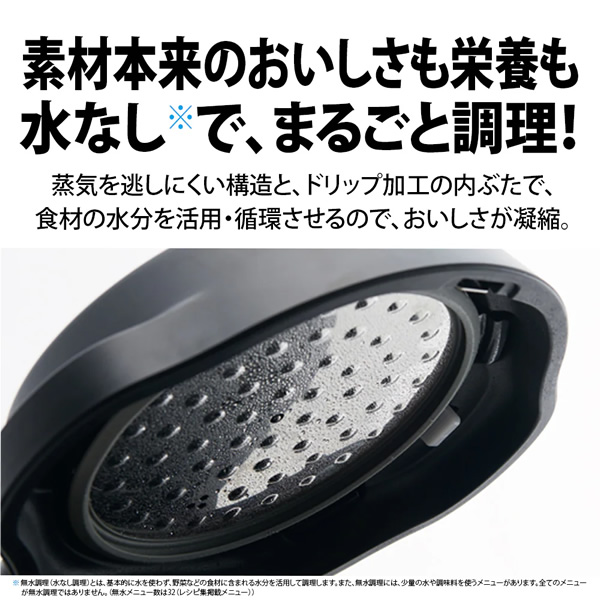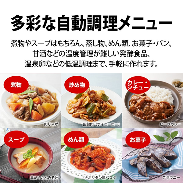 ■ SHARP(シャープ) ■機能「まぜナビ」搭載の2〜4人用◆ 主な特長 ◆●【まぜナビ】料理に最適なタイミングと混ぜかたを教えてくれる!ホットクックで培った、かき混ぜのノウハウで、加熱の進行に合わせて適切なタイミングと混ぜかたをナビ。食材の中まで味がしみこみ、ムラを抑えておいしく仕上げます。※まぜナビ:すべてのメニューが対象ではありません。(まぜナビ対象メニュー数は31(レシピ集掲載メニュー))まぜナビは解除することができます。●【火加減自動】ダブルセンサーで難しい火加減もおまかせ!温度センサー・蒸気センサーのダブルセンサーで常に鍋の中の温度をみはり、食材の量や状態に応じて自動で火加減を調整します。分厚いお肉や根菜も絶妙のとろ火でやわらかく煮こみます。●【無水でおいしい】無水※で、素材本来のおいしさも栄養も、まるごと調理!蒸気を逃しにくい構造と、ドリップ加工の内ぶたで、食材の水分を活用・循環させるので、素材本来のおいしさが凝縮されます。※無水調理(水なし調理)とは基本的に水を使わず、野菜などの食材に含まれる水分を活用して調理します。また、無水調理には、少量の水や調味料を使うメニューがあります。全てのメニューが無水調理ではありません。(無水メニュー数は32(レシピ集掲載メニュー))●お手入れや、使いやすさにこだわりましたパーツはカンタンに脱着することができ、食洗機も使えてお手入れがラクラクです。●予約調理※なら、朝セットして帰宅時にはアツアツ料理が完成食材の衛生面に配慮しながら、最大15 時間の予約調理が可能※全てのメニューが対象ではありません。(予約可能メニュー数は26(レシピ集掲載メニュー))予約選択時は、まぜナビ機能がOFFとなります。●煮物からおもてなし料理、お菓子まで、多彩な自動調理メニュー煮物はもちろん、発酵・低温調理、お菓子など多彩なジャンルのメニューがホットクック1台で調理できます。また、付属の蒸しトレイを使えば、上下2 段で2 種類のメニューが同時に調理可能です。◆ 主な仕様 ◆■電源:AC 100V 50-60Hz 共用■定格消費電力:600W■調理容量:1.6L■満水容量:3.4L■設定温度(発酵・低温調理):35〜90℃※1■最大予約設定時間:15時間(ごはん類※2は12時間)■保温:最大12時間■外形寸法:幅316mm×奥行308mm×高さ221mm■質量:約3.9kg■電源コードの長さ:約1.4m(マグネットプラグ方式)■掲載メニュー数※3:100(自動メニュー90 / 手動メニュー10)※135〜65℃は1℃単位、65℃以上は5℃単位※2ごはん類とは、「ごはん」「ごはん(無洗米)」「玄米ごはん」です。※3同梱のメニュー集および、レシピ集(サポートサイトからダウンロードいただけます。)掲載メニュー簡易商品仕様シリーズ名:ヘルシオホットクックブランド名:SHARP|シャープメーカー型番:KN-MN16H代表カラー:ブラック