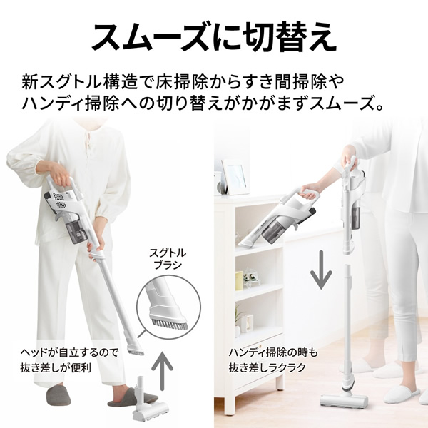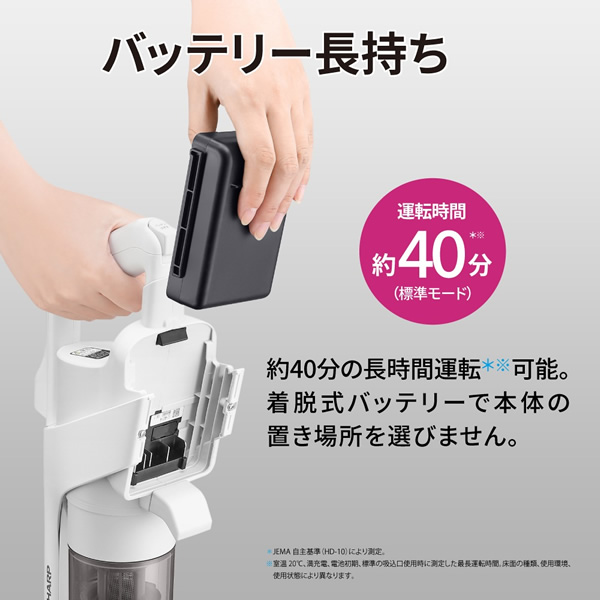 ■ SHARP(シャープ) ■ラクティブエア史上最軽量※1&運転音※2/不快音低減※1ラクティブエア シリーズ従来機種において。標準質量(本体、バッテリー、パイプ、吸込口の合計質量)1.2kg。2025年度機種EC-FR11、2024年度機種EC-AR10/FR10も同様に1.2kg。※2強モード時 64dB。◆ 主な特長 ◆●ラクティブエア史上最軽量※41.2kg*の軽量ボディに加え、重心バランスがよく軸がブレにくい本体と、小回りがきく吸込口で、さらに快適にお掃除できます。●やさしい運転音独自の低騒音化技術により、運転音と運転時に不快に感じる耳障りな音(ピーク音)を抑制。周りも時間も気にせず、お掃除することができます。●便利機能様々な掃除スタイルでごみを照らす「どこでもライト」やかがまずスムーズにお掃除ができる「新スグトル構造」など便利な機能が盛りだくさん。●環境配慮設計再生プラスチック材や分別しやすい着脱式バッテリーを採用。また樹脂部品の塗装や印刷を削減するなどリサイクル性に配慮しています。*JEMA自主基準(HD-10)により測定。※4当社ラクティブエア シリーズ従来機種において。標準質量(本体、バッテリー、パイプ、吸込口の合計質量)1.2kg。2025年度機種EC-FR11、2024年度機種EC-AR10/FR10も同様に1.2kg。◆ 主な仕様 ◆■集塵方式:サイクロン式■ブラシタイプ:自走式パワーブラシ(から拭きパワーブラシ)■充電池:BY-5SC25(18V 2,500mAhバッテリー)■運転時間(約):標準モード:40分/60分自動モード:11〜28分強モード:11分■充電時間(約):1時間40分■本体寸法(約):幅209×奥行227×高さ957mm■重量(約):1.2kg■運転音:57〜64dB■集塵容積(約):0.13L■付属品:すき間ノズルハンディノズルスタンド台充電器バッテリースグトルブラシツールホルダー本製品は電気用品安全法に基づくPSE適合品です。PSマークの種類:PSE届出事業者名:シャープ株式会社簡易商品仕様シリーズ名:RACTIVE Airブランド名:SHARP|シャープメーカー型番:EC-AR11-B代表カラー:ブラックカラー:ブラック集塵方式:サイクロン掃除機タイプ:スティック型本体重量:1.2kgコードレス使用:コードレス使用可能ブランド名(カナ):シャープ