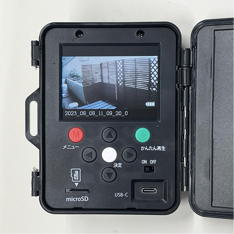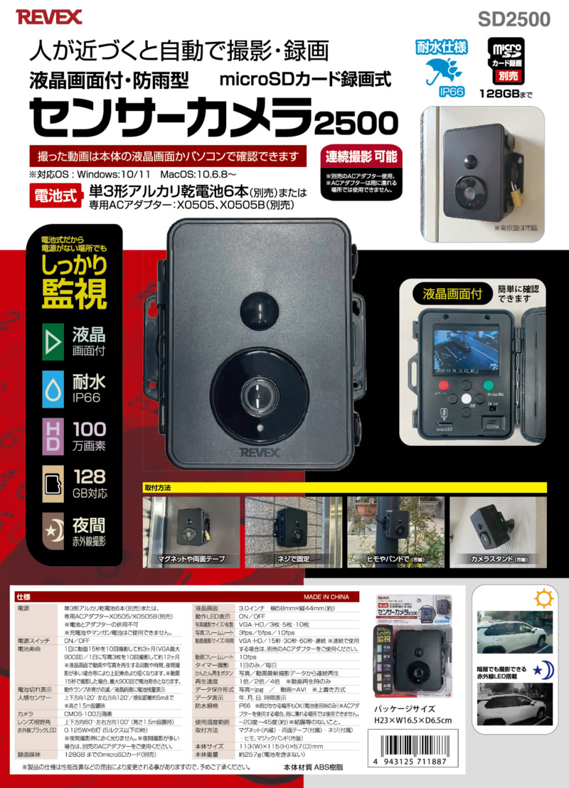 ■ REVEX(リーベックス) ■侵入者やストーカーを感知するとその場でmicroSDカードに自動録画します。液晶画面付きなので、パソコン無しでも録画した画像を確認できます。※パソコンでも確認できます。(対応OS:windows10〜/MacOS10.6.8〜)◆ 主な特長 ◆●電池式だからどこにでも設置できます。●最大100万画素の録画が可能です。●最大128GBまでのmicroSDカードに対応しています。●夜間でも赤外線LEDで録画します。●動画モード・静止画モードを選べます。●連続撮影もできます(タイマー設定時間内)。●撮った画像はパソコンでも確認できます。●屋外でも使用可能です(IP66)●ストーカー対策に●ゴミの不法投棄対策に●侵入者対策に●農作物荒し対策に●車上荒らし対策に◆ 主な仕様 ◆■電源:単3形アルカリ電池6本(別売)、又は、ACアダプター X0505(白1.8m)/X0505B(黒3m)(別売)■電池寿命:動画(15秒)を1日10回録画して約3カ月(夜間撮影が多い場合は赤外線LED点灯のため短くなります)■録画媒体:128GBまでのmicroSDカード(別売)■カメラ:CMOS-最大100万画素(2段階切り替え可能)■液晶画面:3インチ■動画撮影時間:15秒・30秒・60秒・連続(切り替え可能)■本体サイズ:W11.3×H11.5×奥行5.7cm■本体重量:257g(電池を含まない)■素材・材質:ABS樹脂■生産国:中国簡易商品仕様シリーズ名:-ブランド名:REVEX|リーベックスメーカー型番:SD2500原産国/製造国:-代表カラー:ブラック屋内・屋外:屋外防犯カメラの種類:防犯カメラ防滴・防水機能:有人感センサー:有夜間・暗所撮影:有ブランド名(カナ):リーベックス