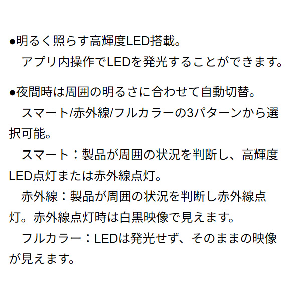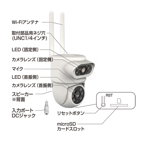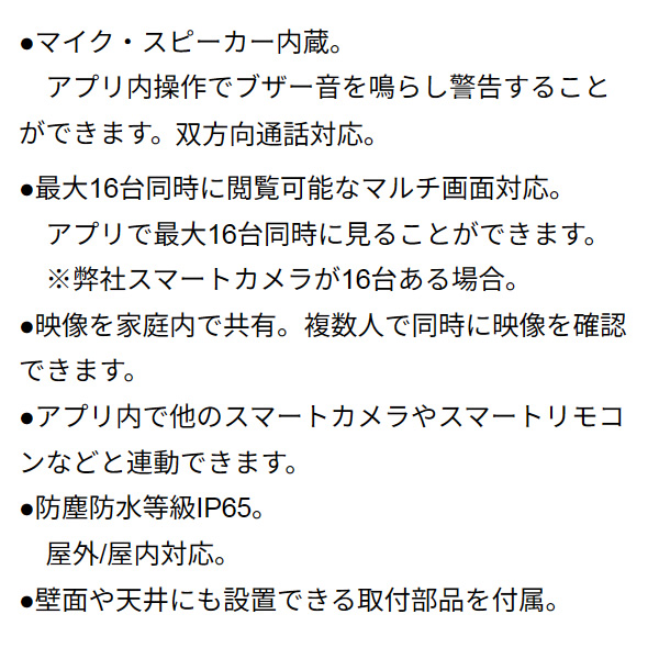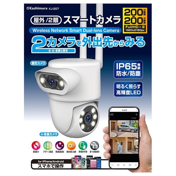 ■ KASHIMURA(カシムラ) ■スマートカメラ 2眼/防水/首振/照明首振カメラと固定カメラの2眼流、もしもの時の屋外用安心カメラ。◆ 主な特長 ◆●首振カメラと固定カメラ、2つのカメラを搭載。アプリで同時に2つの映像を確認できるスマートカメラ。●外出先からスマートフォンで屋外/屋内をリアルタイムで確認できます。●首振り対応。※首振カメラ側のみスマートフォン操作でカメラを自由に動かせるので見たいところに調節可能。(左右350°上下110°)●自動追跡機能。※首振カメラ側のみ動くものを自動で追いかけます。●動体検知で記録写真撮影とスマートフォンへの通知が可能。※首振カメラ側のみ映像や画像はスマートフォンへの記録、microSDカード録画、クラウド(有償)録画に対応。●200万画素の高画質とデータ通信量を抑えるための低画質を切替可能。●microSDカード対応。過去の記録も確認できます。※microSDカードは付属していません。※microSDカードに記録した動画や画像は製品本体装着時に限りアプリ内でのみ確認できます。●マイク・スピーカー内蔵。アプリ内操作でブザー音を鳴らし警告することができます。双方向通話対応。●明るく照らす高輝度LED搭載。アプリ内操作でLEDを発光することができます。●夜間時は周囲の明るさに合わせて自動切替。スマート/赤外線/フルカラーの3パターンから選択可能。スマート:製品が周囲の状況を判断し、高輝度LED点灯または赤外線点灯。赤外線:製品が周囲の状況を判断し赤外線点灯。赤外線点灯時は白黒映像で見えます。フルカラー:LEDは発光せず、そのままの映像が見えます。●最大16台同時に閲覧可能なマルチ画面対応。アプリで最大16台同時に見ることができます。※弊社スマートカメラが16台ある場合。●映像を家庭内で共有。複数人で同時に映像を確認できます。●アプリ内で他のスマートカメラやスマートリモコンなどと連動できます。●防塵防水等級IP65。屋外/屋内対応。●壁面や天井にも設置できる取付部品を付属。※本製品は国内専用です。海外では使用できません。◆ 主な仕様 ◆■本体色:ホワイト■無線方式:無線LAN(Wi-Fi)■準拠規格:IEEE802.11 b/g/n 2.4GHz■通信周波数帯域:2.4GHz ※5GHz非対応■セキュリティ:WPA/WPA2-PSKSSL/TLSによる128ビット AES 暗号化■動画解像度:FHD:1920×2160ピクセル360P:640×720ピクセル■フレームレート:15fps■動画フォーマット:mp4(スマートフォンへの保存時)■静止画解像度:FHD:1920×2160ピクセル360P:640×720ピクセル■静止画フォーマット:png / jpg(スマートフォンへの保存時)■イメージセンサー:1/2.9"CMOS 200万画素×21920×1080ピクセル■レンズ:F値:2.0 / 焦点距離:3.6mm■赤外線暗視:850 nm IR LED 10m■可動域:水平に350°/垂直に110°※首振カメラ側■防塵防水性能:IP65(防塵レベル:6 粉塵が内部に侵入しない:最上級)(防水レベル:5 いかなる方向からの水の直接噴流によっても有害な影響をうけない。)■記録媒体:スマートフォン、クラウド(有償)microSD(1〜128GB)SDHCまたはSDXC■データ通信量:FHD:8〜16MB/分360P:2〜8MB/分■本体入力:DC12V 1A■付属ACアダプター入力:AC100-240V 50/60Hz 0.3A■付属ACアダプター出力:DC12V 1A■アプリ:スマートライフ+■対応システム:iOS13以上のiPhoneAndroid8以上のスマートフォン■動作環境温度:-10〜50℃(結露しないこと)■付属品:ACアダプター/取付用部品/取付用ネジ/アンカー部品■本体サイズ/重量:89W×137H×115Dmm(アンテナ部含まず) / 365g簡易商品仕様シリーズ名:-ブランド名:KASHIMURA|カシムラメーカー型番:KJ-207原産国/製造国:-代表カラー:ホワイトスマートフォン対応:有屋内・屋外:屋外防犯カメラの種類:ネットワークカメラ防滴・防水機能:有カラー:ホワイト夜間・暗所撮影:有ブランド名(カナ):カシムラ