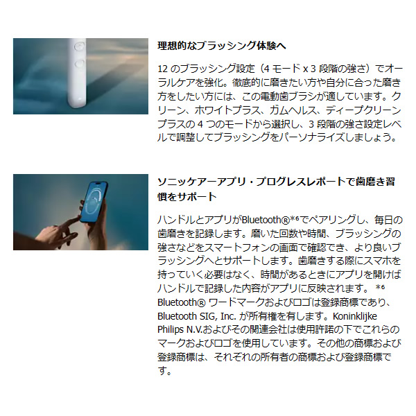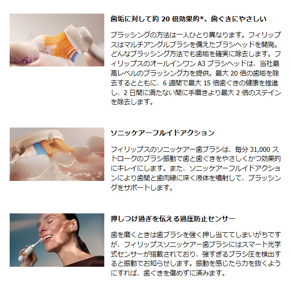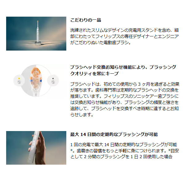 ■ PHILIPS(フィリップス) ■その歯の輝き、まるでダイヤモンド優れた歯垢除去力*1とステイン除去を誇る、エレガントなデザインのダイヤモンドクリーン9000*1弊社製品ラインナップでの比較◆ 主な特長 ◆●歯垢に対して約 20 倍効果的*、歯ぐきにやさしいブラッシングの方法は一人ひとり異なります。フィリップスはマルチアングルブラシを備えたブラシヘッドを開発。どんなブラッシング方法でも歯垢を確実に除去します。フィリップスのオールインワン A3 ブラシヘッドは、当社最高レベルのブラッシング力を提供。最大 20 倍の歯垢を除去するとともに、6 週間で最大 15 倍歯ぐきの健康を推進し、2 日間に満たない間に手磨きより最大 2 倍のステインを除去します。●ソニッケアーフルイドアクションフィリップスのソニッケアー歯ブラシは、毎分 31,000 ストロークのブラシ振動で歯と歯ぐきをやさしくかつ効果的にキレイにします。また、ソニッケアーフルイドアクションにより歯間と歯肉縁に深く液体を噴射して、ブラッシングをサポートします。●押しつけ過ぎを伝える過圧防止センサー歯を磨くときは歯ブラシを強く押し当ててしまいがちですが、フィリップスソニッケアー歯ブラシにはスマート光学式センサーが搭載されており、強すぎるブラシ圧を検出すると振動でお知らせします。振動を感じたら力を抜くようにすれば、歯ぐきを傷めずに済みます。●理想的なブラッシング体験へ12 のブラッシング設定(4 モード x 3 段階の強さ)でオーラルケアを強化。徹底的に磨きたい方や自分に合った磨き方をしたい方には、この電動歯ブラシが適しています。クリーン、ホワイトプラス、ガムヘルス、ディープクリーンプラスの 4 つのモードから選択し、3 段階の強さ設定レベルで調整してブラッシングをパーソナライズしましょう。●ソニッケアーアプリ・プログレスレポートで歯磨き習慣をサポートハンドルとアプリがBluetoothR*?でペアリングし、毎日の歯磨きを記録します。磨いた回数や時間、ブラッシングの強さなどをスマートフォンの画面で確認でき、より良いブラッシングへとサポートします。歯磨きする際にスマホを持っていく必要はなく、時間があるときにアプリを開けばハンドルで記録した内容がアプリに反映されます。 *? BluetoothR ワードマークおよびロゴは登録商標であり、Bluetooth SIG, Inc. が所有権を有します。Koninklijke Philips N.V.およびその関連会社は使用許諾の下でこれらのマークおよびロゴを使用しています。その他の商標および登録商標は、それぞれの所有者の商標および登録商標です。●こだわりの一品洗練されたスリムなデザインの充電用スタンドを含め、細部にわたってフィリップスの専任デザイナーとエンジニアがこだわりぬいた電動歯ブラシ。●ブラシヘッド交換お知らせ機能により、ブラッシングクオリティを常にキープブラシヘッドは、初めての使用から 3 ヶ月を過ぎると効果が落ちます。歯科専門家は定期的なブラシヘッドの交換を推奨しています。フィリップスのソニッケアー歯ブラシには交換お知らせ機能があり、ブラッシングの頻度と強さを追跡して、ブラシヘッドを交換すべき時期に達するとお知らせします。●最大 14 日間の定期的なブラッシングが可能1 回の充電で最大 14 日間の定期的なブラッシングが可能*。歯磨きの習慣をもっと手軽に身につけられます。*目安として 2 分間のブラッシングを 1 日 2 回使用した場合◆ 主な仕様 ◆■電源対応電圧100-240 V■使用時間14 日間■バッテリー充電式■バッテリーの種類リチウムイオンバッテリー■エネルギー消費スタンバイ(ディスプレイオフ)< 0.11W■色ホワイト■内容・付属品ハンドル:ダイヤモンドクリーン 9000 1 本ブラシヘッド:A3 オールインワン 1 本充電器:充電器台と充電器スタンド簡易商品仕様シリーズ名:ソニッケアーブランド名:PHILIPS|フィリップスメーカー型番:HX991170代表カラー:ホワイト研磨方法:振動式電源方式:充電タイプカラー:ホワイトブランド名(カナ):フィリップスシリーズ名(カナ):ソニッケアー