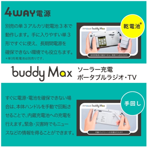 ■ NH Technology ■innowa buddy Max ソーラー充電 手回し ポータブルテレビ・ラジオ 4WAY電源 LEDライト モバイルバッテリー 防災 アウトドア◆ 主な特長 ◆innowa buddy Maxポータブルラジオ・TV災害時にも日常にも、あなたの相棒!4WAY電源、ワンセグTV、AM/FM/ワイドFM/短波、LEDライト、サイレン、スマホ充電、蓄光シール、ハンドストラップ、防災ラジオ、防災テレビ■4WAY充電1.ソーラー充電本体上部に設置している ソーラーパネルより 充電することができます。※ソーラー充電は太陽光の強さに左右されます。薄曇りでも正常にご利用出来ない場合があります。2.充電池付属のUSBケーブルとACアダプターを接続して、電源を供給・充電することができます。充電中もテレビ・ラジオの視聴は可能です。3.乾電池別売の単3アルカリ乾電池3本で動作します。手に入りやすい単3形ですぐに使え、長期間電源を確保できない環境でも役立ちます。*単3形乾電池は別売りです。4.手回しすぐに電源・電池を確保できない場合は、本体ハンドルを手動で回転させることで、内蔵充電池への充電を行えます。緊急・災害時でもニュースなどの情報を得ることができます。■ワンセグTV5インチ大画面液晶の見やすい設計で、ワンセグTVの視聴ができます。■AM・FMラジオラジオはAM・FM・短波に切り替えできます。AMラジオの番組をFM放送の周波数で聴けるので、ビルやマンションなどAM放送が入りづらい場所でもクリアな音質でAMラジオ番組を楽しめます。付属の短波用外部アンテナを使用することで、ラジオNIKKEIを含む短波(SW)放送も受信可能です。■LEDライト夜間や停電時に便利なLEDライトを搭載しています。■サイレン緊急時・災害時、ご自身の居場所を知らせる時などに役立つ「サイレン」を搭載しています。■携帯充電内蔵充電池、手回し充電からiPhoneなどのスマートフォン、携帯電話を充電できるので、緊急時にモバイルバッテリーとしても活躍します。■蓄光シール急な停電時に備えて、暗闇で光る蓄光シールを本体用に付属しています。■ハンドストラップ持ち運びに便利なハンドストラップを付属しています。■TV録画別売りのmicroSDカードにTV番組を録画できます。■音楽動画再生別売りのmicroSDカードに 保存した動画や音楽を再生することができます。◆ 主な仕様 ◆■モデル名:buddy Max■モニターサイズ:5インチ液晶■解像度:800×480■受信周波数:ワンセグテレビ:UHF 470〜770MHzFMラジオ:76〜108MHzAMラジオ:522〜1710kHz短波ラジオ:3.8-21.95MHz■電源:本体:入力:DC5V1AACアダブター:入力:AC100V,出力:DC5V1A乾電池:単3形アルカリ乾電池3本内蔵電池:リチウム電池 3.7V 2000mAhソーラー充電:○■スピーカー:1.25WX1■外形寸法:本体175×93×38.5mm■質量(重さ): 375g(本体のみ)■動作温度範囲:0℃~40℃■保存温度範囲:-10℃~60℃■端子:イヤホン:3.5mmステレオ端子携帯充電用:USB端子(Type-A)本体電源用:USB端子(Type-C)■対応メディア (別売り):microSDカード 4GB〜64GB対応 Class10以上推奨 (フォーマット形式:FAT32 または exFAT)■セット内容:本体、ACアダプター、USBケーブル、 外部アンテナ、取扱説明書・保証書、蓄光シール■備考:※一部の携帯電話やスマートフォンは充電できない場合がございます。※充電式乾電池は充電できません。※ソーラー充電は太陽光の強さに左右されます。薄曇りでも正常にご利用出来ない場合があります。※本機は主にラジオやライトの使用を目的としてソーラー充電が可能です。本機から携帯電話やスマートフォンへの充電を 目的として、ソーラー充電をご利用いただくことはできません。簡易商品仕様シリーズ名:-ブランド名:innowaメーカー型番:BM001原産国/製造国:-代表カラー:ホワイト