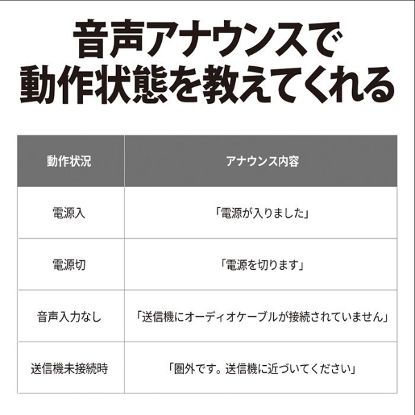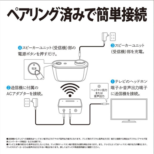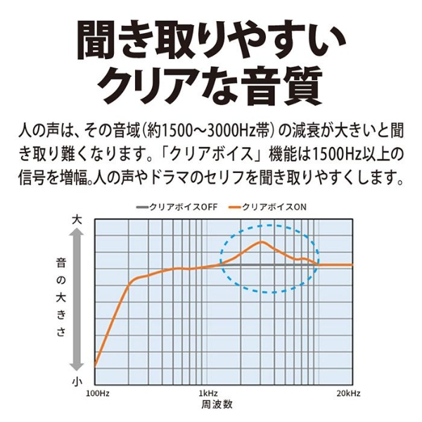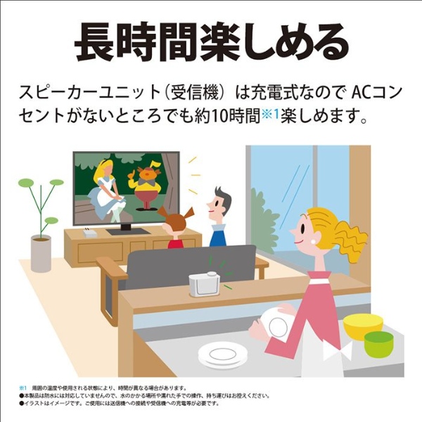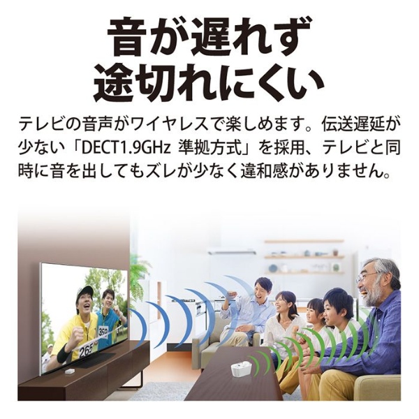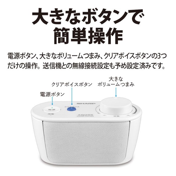 ■ SHARP(シャープ) ■AQUOS サウンドパートナー AN-WSP1テレビの音が手元でくっきり聞こえるワイヤレススピーカー。◆ 主な特長 ◆■音が遅れず途切れにくいテレビの音声がワイヤレスで楽しめます。伝送遅延が少ない「DECT1.9GHz準拠方式」を採用しており、テレビと同時に音を出してもズレが少なく違和感がありません。また、音声圧縮コーデックには低遅延・高音質を実現するADPCMを採用しています。■聞き取りやすいクリアな音質独自の「クリアボイス」機能が人の声やドラマのセリフを聞き取りやすくします。人の声の音域(約1500〜3000Hz帯)の減衰が大きいと聞き取り難くなります。クリアボイス機能入り時は1500Hz以上の信号を増幅させることで人の声を聞き取りやすくします。■家中好きな場所に持ち運べるコンパクトで軽量だから好きな場所に持ち運んで楽しめます。スピーカーユニット(受信機)は充電式なのでACコンセントがないところでも約10時間※楽しめます。※ 周囲の温度や使用される状態により、時間が異なる場合があります■大きなボタンで簡単操作電源ボタン、大きなボリュームつまみ、クリアボイスボタンの3つだけの操作。送信機との無線接続設定も予め設定済みです。◆ 主な仕様 ◆■通信方式:DECT1.9GHz方式■最大到達距離:約70m(直線見通し距離)■寸法(幅×奥行×高さ):151×71×83mm(スピーカーユニット部)/ 65×52×23mm(送信機)■質量:約260g(スピーカーユニット部)/ 約40g(送信機)■スピーカーユニット(受信機)部:実用最大出力:1W(モノラル、JEITA※1)スピーカー:Φ50mm(インピーダンス8Ω)電源入力:DC5V 2000mA(付属のACアダプターを使用)充電時間:最大約5時間(ACアダプター使用)※2連続使用時間:最大約10時間※2オートパワーオフ:○(10分間音声入力信号がない場合に自動的に電源をオフ)■送信機部:電源入力:DC5V 2000mA(付属のACアダプターを使用)音声入力端子:φ3.5mmステレオミニジャック■同梱品:送信機、ACアダプター(スピーカーユニット部用)、ACアダプター(送信機用)、オーディオケーブル(3極Φ3.5mm)(1.5m)、取扱説明書※1 実用最大出力は、JEITA(電子情報技術産業協会)規格による測定値です。※2 周囲の温度や使用される状態により、時間が異なる場合があります簡易商品仕様カラー:-シリーズ名:AQUOS(シャープ)ブランド名:SHARP|シャープメーカー型番:AN-WSP1