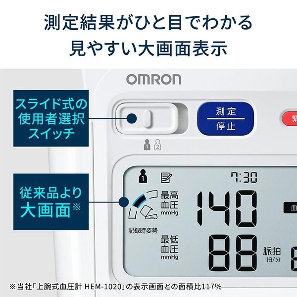 ■ OMRON(オムロン) ■◆ 主な特長 ◆●カフ開閉による電源ON/OFFカフを開けることにより電源が立ち上がり、従来品より測定までのステップ数を削減●スライドスイッチ前回と同じ使用者が測定する場合、ユーザー選択不要。●血圧確認機能血圧状態をわかりやすく文字でお知らせ。●LCDサイズ拡大画面サイズを拡大することで、文字がさらに見やすい。◆ 主な仕様 ◆■計測位置:上腕■電源専用ACアダプタ:AC100V 50/60Hz 18VA単2形アルカリ乾電池4個:DC6V 6W■測定方式:オシロメトリック法■適応腕周(約):17〜32cm■メモリー:100回×2人分■サイズ(約):幅17.9×奥行24.6×高さ21.1cm■質量(約):1700g(電池含まず)■付属品:専用ACアダプタ、取扱説明書(品質保証書付き)■医療機器認証番号:305AHBZX00024000簡易商品仕様シリーズ名:HEM-1026シリーズブランド名:OMRON|オムロンメーカー型番:HCR-1802原産国/製造国:-代表カラー:ホワイトブランド名(カナ):オムロン測定部位:上腕電源方式:AC給電|電池タイプ最大メモリー回数:100医療機器認証番号:305AHBZX00024000平均値表示:有医療機器区分:管理医療機器本体奥行:246mm最大メモリー人数:2本体横幅:179mm本体高さ:211mm本体重量:1700g
