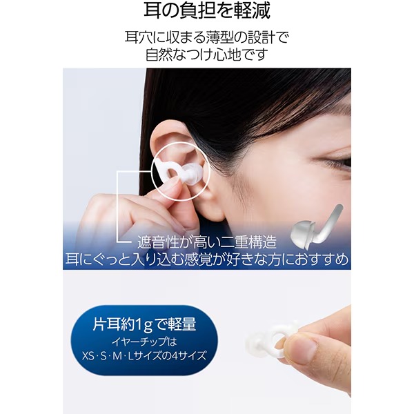 ■ ELECOM(エレコム) ■朝までずっと、静かな眠りを。高い遮音性能で快眠環境をサポートする耳栓”エクリア イヤープラグ デュオ”です。二層構造のシリコンチップとd字形状が耳穴にぴったりフィットして睡眠中も外れにくく、音をしっかり遮断。コンパクトなケース付きで、保管や旅行での持ち運びに便利です。◆ 主な特長 ◆■高い遮音性能で快眠環境をサポートする耳栓”エクリア イヤープラグ デュオ”です。朝まで快適に騒音から守ります。■形の異なる二重構造のシリコンチップが、耳穴にしっかりフィットして音を遮断するので、賑わいのある場所でも使用できます。耳にぐっと入り込む感覚が好きな方におすすめです。■耳甲介にもフィットするd字形状が耳穴に密着して、睡眠中も外れにくく、紛失を防ぎます。探す手間が減ることで、忙しい朝にも少しゆとりが生まれます。■耳穴に収まる薄型設計。横向きで寝ても気にならず、自然なつけ心地です。■長時間の使用でも耳に負担がかかりにくい、片耳わずか約1gの軽量設計です。■仕事や勉強、カフェでの作業など、集中したいシーンでも活躍します。■飛行機での移動中や自宅でのリラックスタイム、生活音が気になるときなどにおすすめです。■水洗いが可能で、いつでも清潔に保てます。手軽に洗えて、繰り返し何度でも使用できます。■保管や持ち運びに便利なケース付き。ポケットやバッグにもすっきり収まるコンパクトサイズです。■ケースは片手でスマートに開閉できるスライド式。使いたいときにサッと取り出せます。■ケースはループ付きで、カラビナやベルトにも装着可能。バッグの中などでも見つけやすく、紛失を防ぎます。■イヤーチップはXS・S・M・Lサイズの4サイズを付属し、フィット感を調整できます。■自社環境認定基準を1つ以上満たし、『THINK ECOLOGY』マークを表示した製品です。■環境保全に取り組み、製品の包装容器が紙・ダンボール・ポリ袋のみで構成されている製品です。◆ 主な仕様 ◆■カラー:ホワイト■外形寸法:耳栓本体(片耳/イヤーチップ付き):幅約25mm×厚み約17mm×高さ約15.5mm、収納ケース:幅約72mm×厚み約23mm×高さ約23mm■質量:耳栓本体(片耳/イヤーチップ付き):約1.1g、収納ケース:約28g■セット内容:耳栓本体、収納ケース、イヤーチップ4サイズ(XS/S/M/L)■材質:耳栓本体:シリコン、イヤーチップ:シリコン、収納ケース:ABS・シリコン簡易商品仕様シリーズ名:ECLEARブランド名:ELECOM|エレコムメーカー型番:HCSL-EP02WH原産国/製造国:-代表カラー:ホワイト素材(生地・毛糸):シリコンブランド名(カナ):エレコムシリーズ名(カナ):エクリア