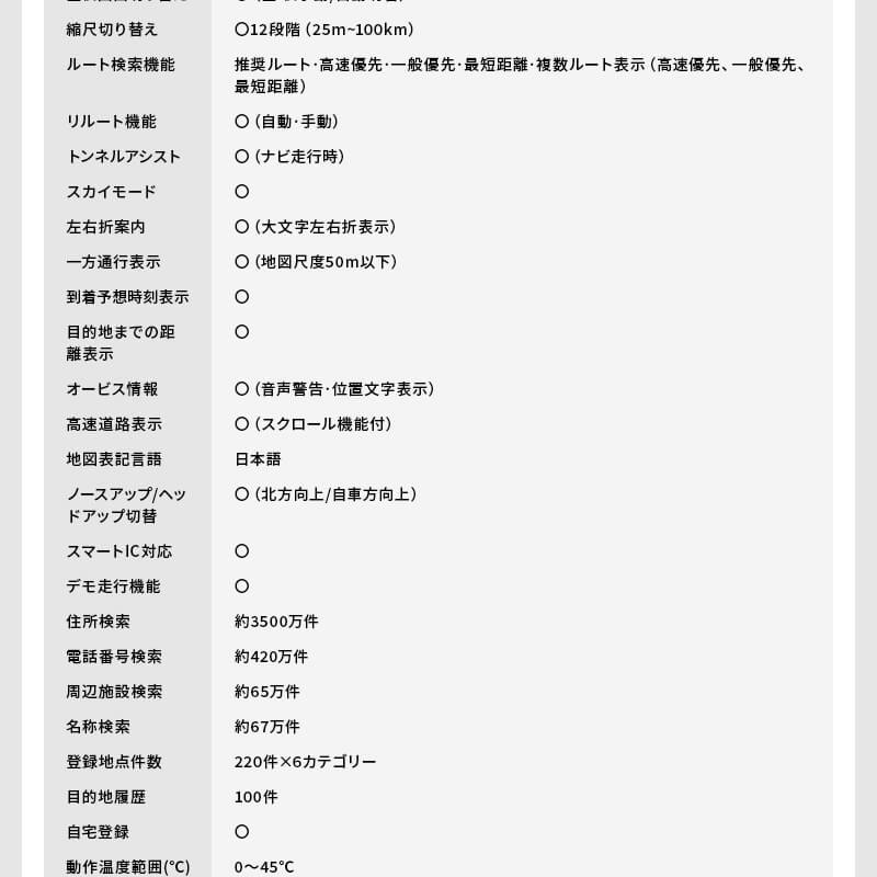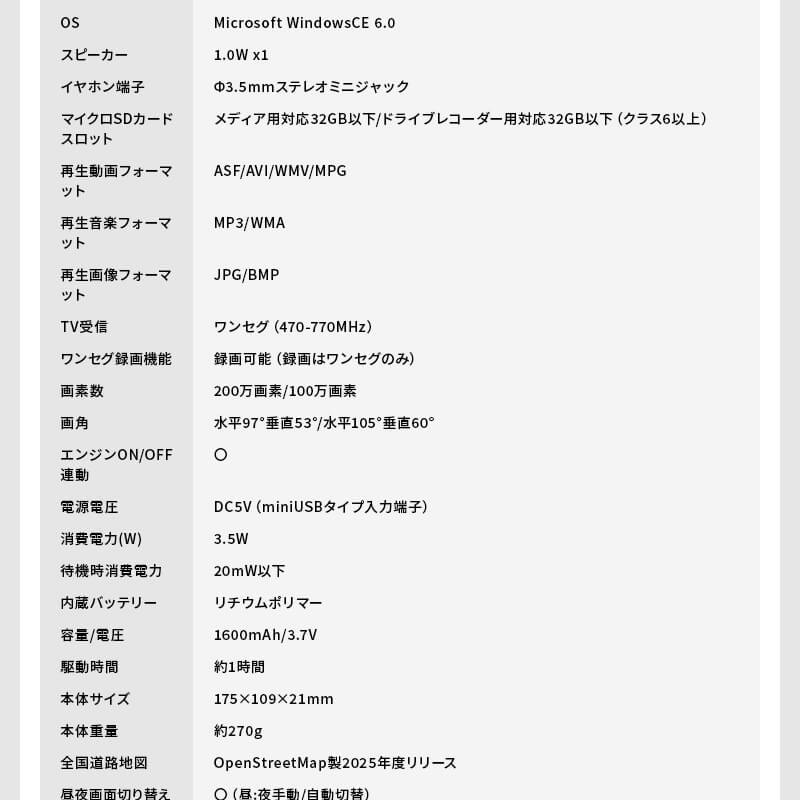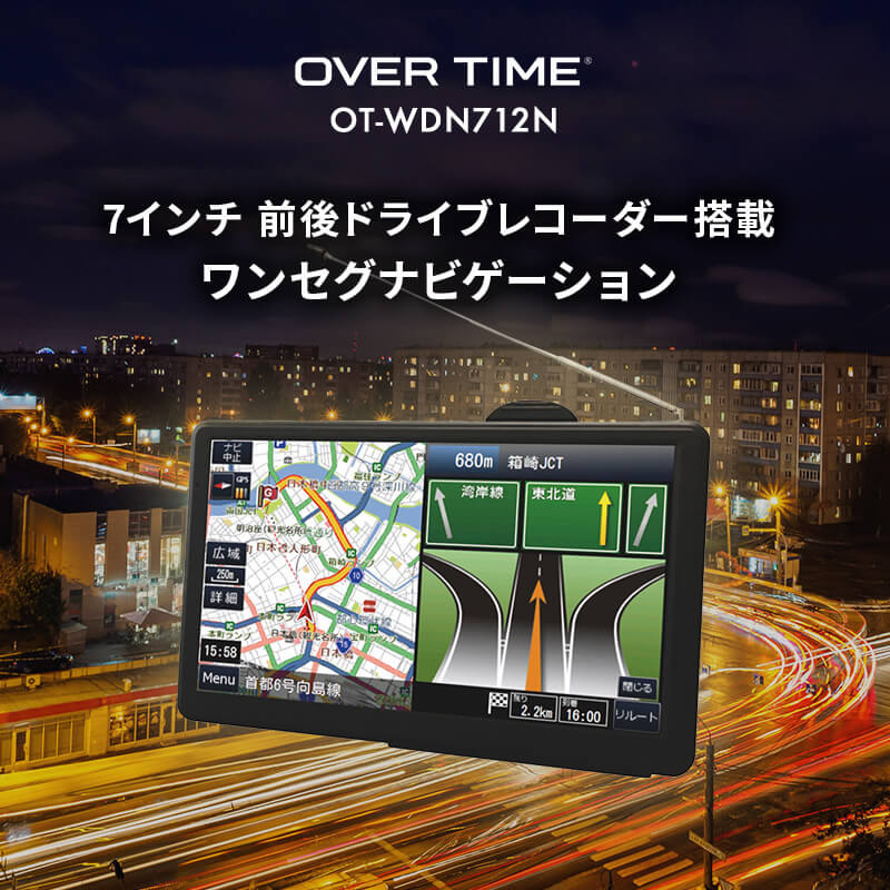 ※取り付けサービスは行っておりません。※初期不良等の場合に発生する取付・取外し作業や、車両に関わる保障はございません。あらかじめご了承願います。※車両により、取り付けキットが必要な場合がございます。必ずメーカーページにてご確認ください。■ ダイアモンドヘッド ■OVER TIME 7インチ前後ドライブレコーダー搭載 ワンセグナビゲーション OT-WDN712N◆ 主な特長 ◆●2025年度リリース最新地図搭載!●前後ドラレコ機能付きで、安全に運転が楽しめます●快適なドライブをアシスト・速度制限機能走行中に速度注意ゾーンに近づいたら警報が表示されます。・トンネルアシスト機能トンネル内でもナビゲーションが止まることなく作動します。●デモ走行機能搭載デモ走行で事前にドライブルートを確認できます。●3年間更新無料(2回までの無料地図更新)が付属しているので最新の地図で走行が可能です。地図の更新は本製品は発表後の翌年から年1回、計2回まで。(毎年春〜夏頃)更新時期は前後する場合がございます。●車内を楽しく!SDカードに保存した動画や音楽などのメディア再生することが可能です。車内を楽しく過ごすことができます。◆ 主な仕様 ◆製品名OVER TIME 7インチ前後ドライブレコーダー搭載ワンセグナビゲーション型名OT-WDN712NJAN4573596846117ディスプレイ7インチ 液晶:TFTバックライトLED解像度800x480pixel視野角(上下左右)上30°下15°左30°右30°輝度200cd/m2タッチパネル感圧式CPUMSB2531 ARM Cortex-A7 800MHz内蔵メモリ256MB(DDR SDRAM) Flash 8GBOSMicrosoft WindowsCE 6.0スピーカー1.0W x1イヤホン端子Φ3.5mmステレオミニジャックマイクロSDカードスロットメディア用対応32GB以下/ドライブレコーダー用対応32GB以下(クラス6以上)再生動画フォーマットASF/AVI/WMV/MPG再生音楽フォーマットMP3/WMA再生画像フォーマットJPG/BMPTV受信ワンセグ(470-770MHz)ワンセグ録画機能録画可能(録画はワンセグのみ)画素数200万画素/100万画素画角水平97°垂直53°/水平105°垂直60°エンジンON/OFF連動〇電源電圧DC5V(miniUSBタイプ入力端子)消費電力(W)3.5W待機時消費電力20mW以下内蔵バッテリーリチウムポリマー容量/電圧1600mAh/3.7V駆動時間約1時間本体サイズ175×109×21mm本体重量約270g全国道路地図OpenStreetMap製2025年度リリース昼夜画面切り替え○(昼:夜手動/自動切替)縮尺切り替え○12段階(25m~100km)ルート検索機能推奨ルート・高速優先・一般優先・最短距離・複数ルート表示(高速優先、一般優先、最短距離)リルート機能○(自動・手動)トンネルアシスト○(ナビ走行時)スカイモード〇左右折案内〇(大文字左右折表示)一方通行表示〇(地図尺度50m以下)到着予想時刻表示〇目的地までの距離表示〇オービス情報○(音声警告・位置文字表示)高速道路表示〇(スクロール機能付)地図表記言語日本語ノースアップ/ヘッドアップ切替○(北方向上/自車方向上)切替スマートIC対応〇デモ走行機能〇住所検索約3500万件電話番号検索約420万件周辺施設検索約65万件名称検索約67万件登録地点件数220件×6カテゴリー目的地履歴100件自宅登録〇動作温度範囲(℃)0〜45℃保存温度範囲(℃)-10〜60℃充電時間約4時間簡易商品仕様ブランド名:ダイアモンドヘッドメーカー型番:OT-WDN712N代表カラー:ブラックシリーズ名:OVER TIME画面サイズ:7inシリーズ名(カナ):オーバータイム