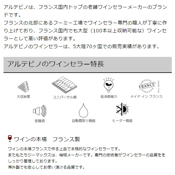 | 付属品 | 棚 13枚、鍵、ワインタグ、取扱説明書、背面スペーサー、木製棚用ロックダボ、ヒンジキャップ |
